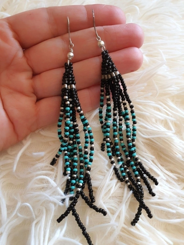 aros con sistema de plata y mostacillas negras y turquesas