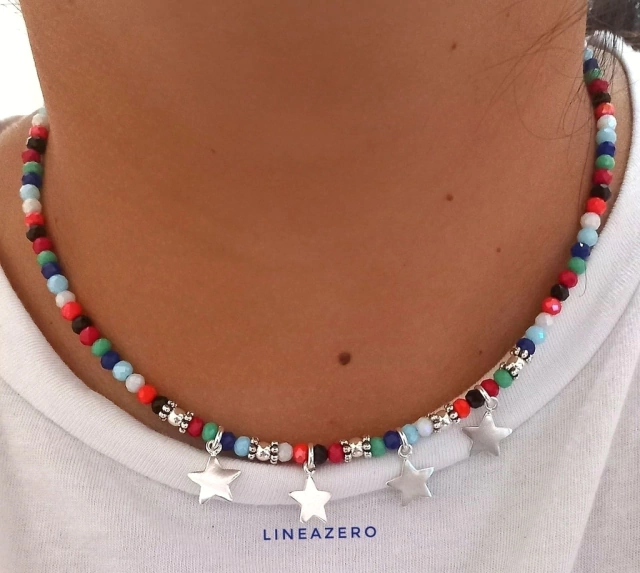 cadena de 40cm con mostacillas y detalles en plata con 4 estrellas .